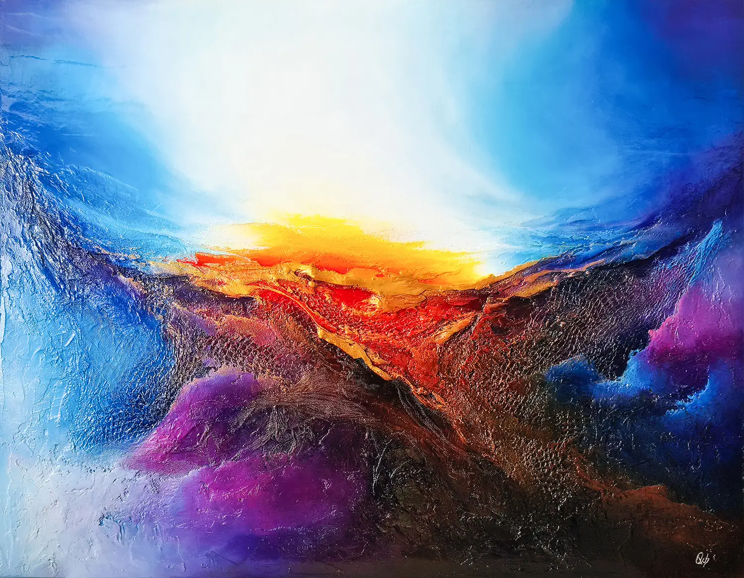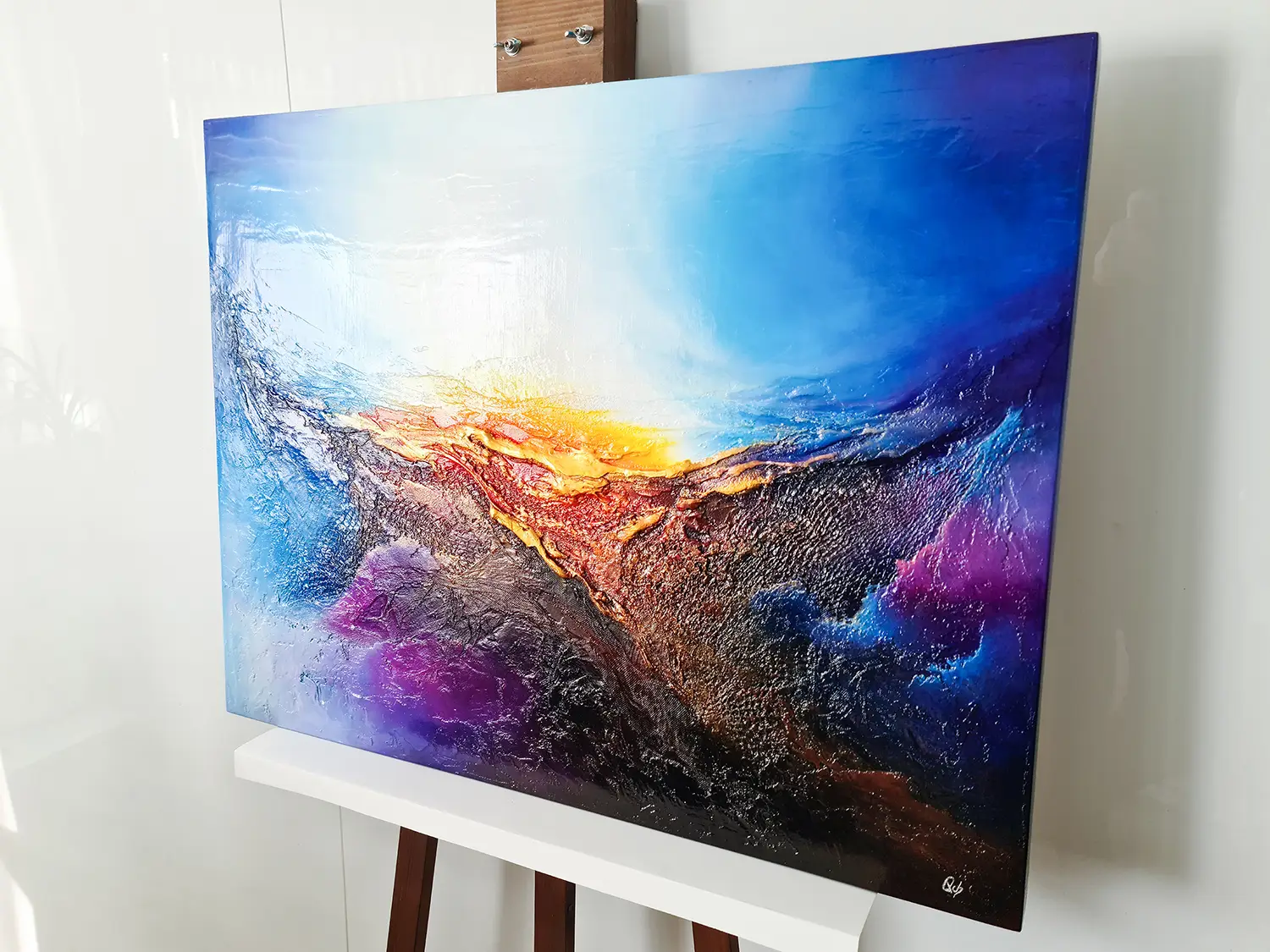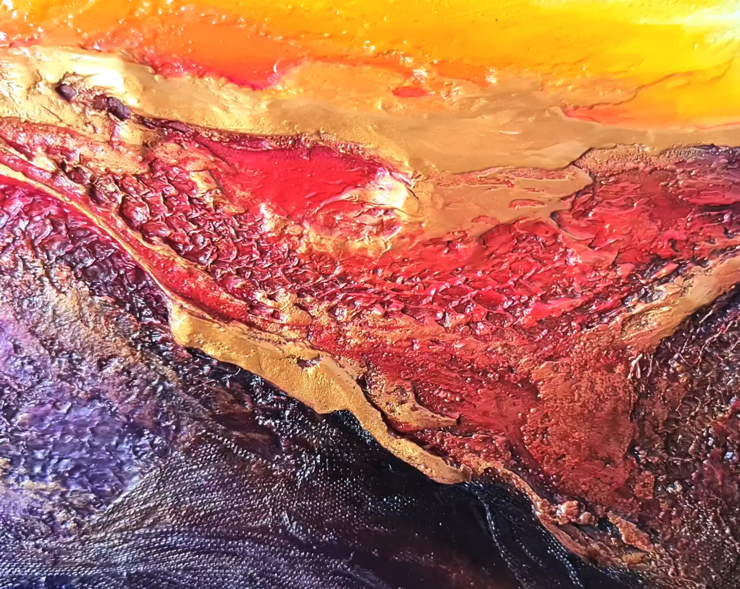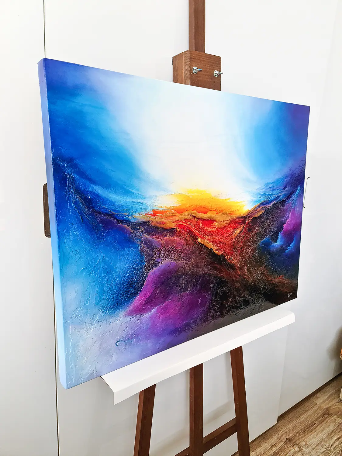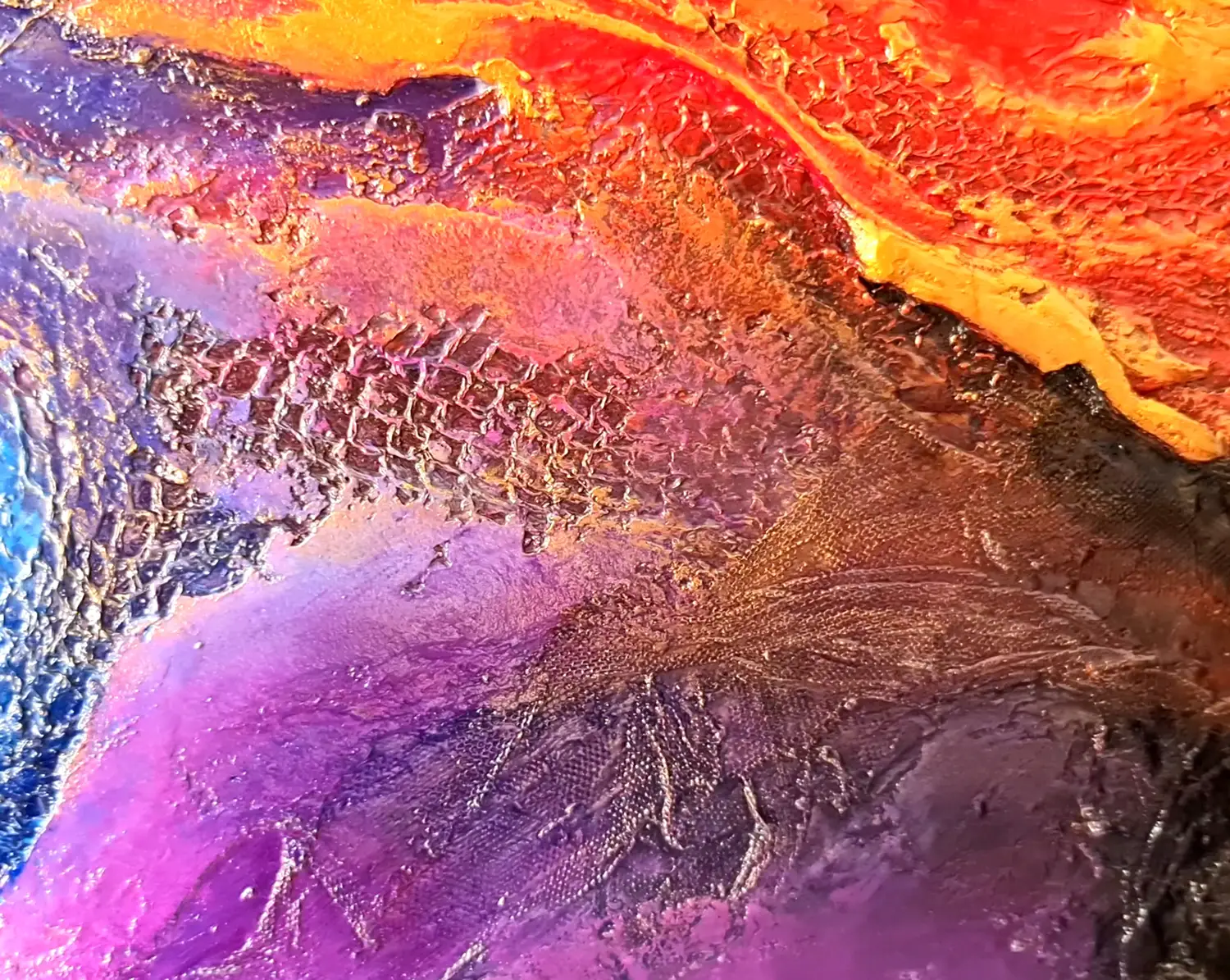 Strukturalny obraz abstrakcyjny namalowany jest na litym panelu, który wykonany jest z drewna i elastycznego tworzywa sztucznego. Farby akrylowe Talens Amsterdam i Liqutex nadają obrazowi nasyconego i wyrazistego wyglądu, a zróżnicowane struktury powstały z włóknin, gipsów i past strukturalnych. Wykończony jest lakierem akrylowym wysokiej jakości o wysokim połysku, do zastosowań profesjonalnych.