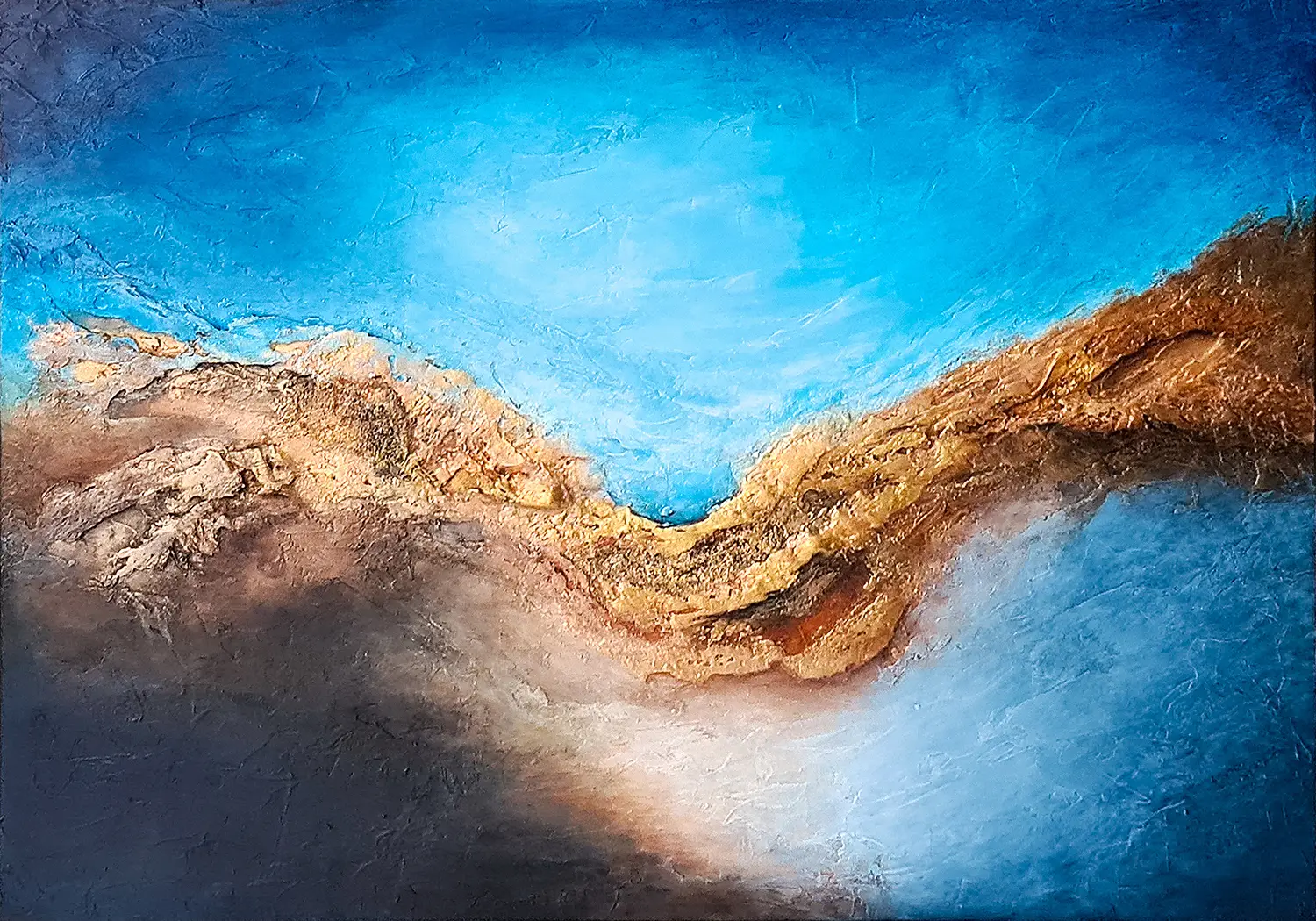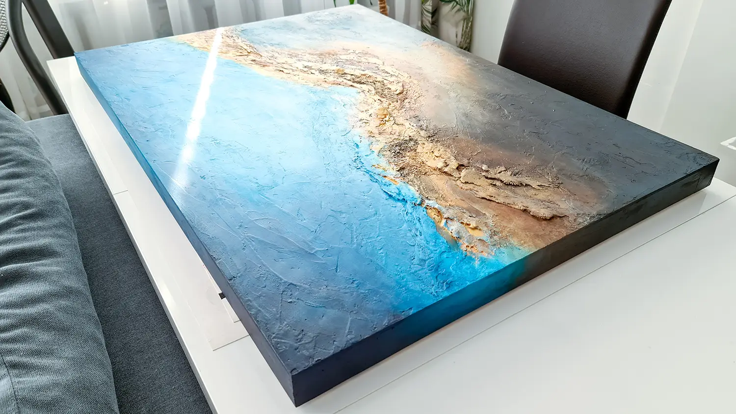 Strukturalny obraz abstrakcyjny namalowany jest na litym panelu, który wykonany jest z drewna i elastycznego tworzywa sztucznego. Farby akrylowe Talens Amsterdam i Liqutex nadają obrazowi nasyconego i wyrazistego wyglądu, a zróżnicowane struktury powstały z włóknin, gipsów i past strukturalnych. Wykończony jest lakierem akrylowym wysokiej jakości o wysokim połysku, do zastosowań profesjonalnych.