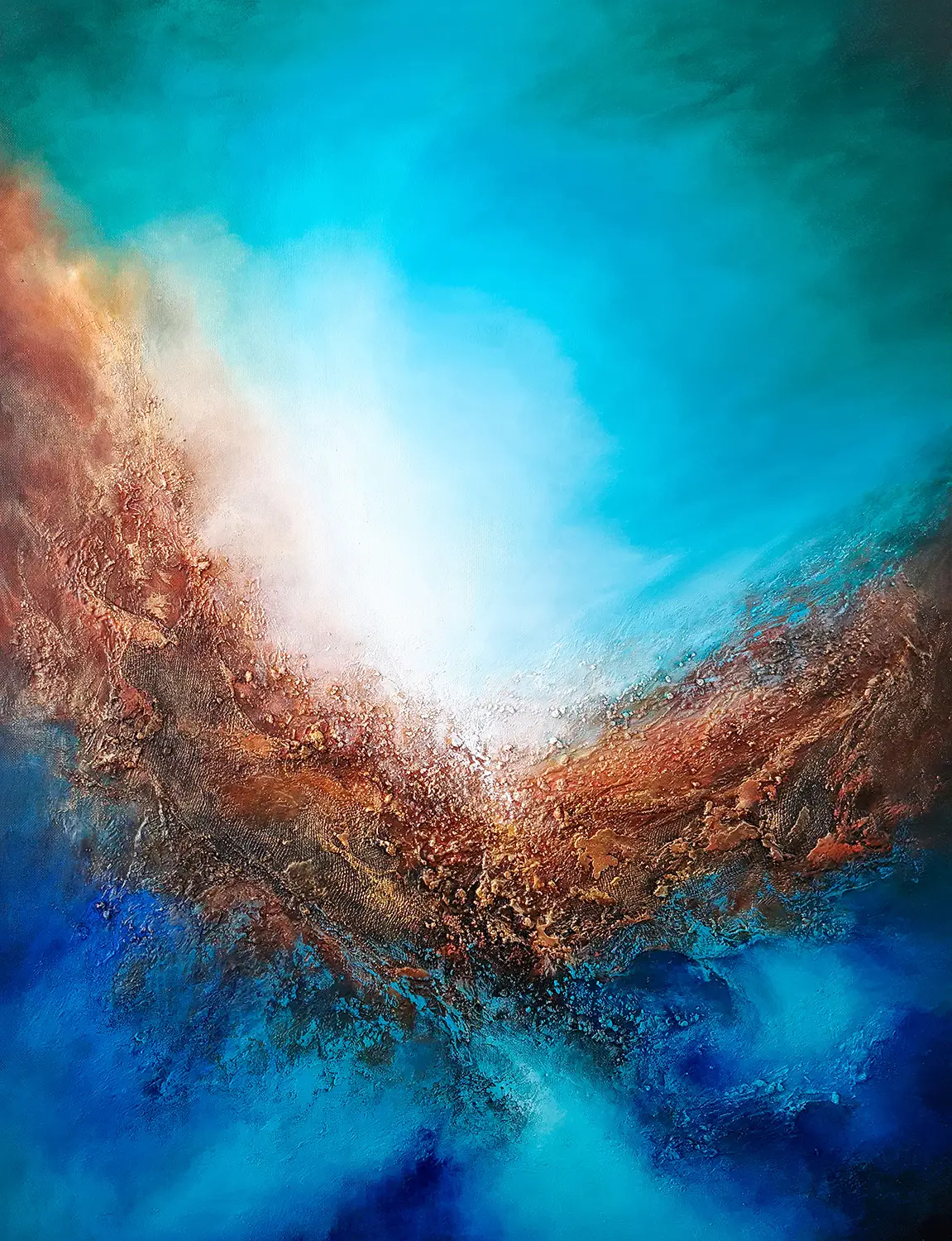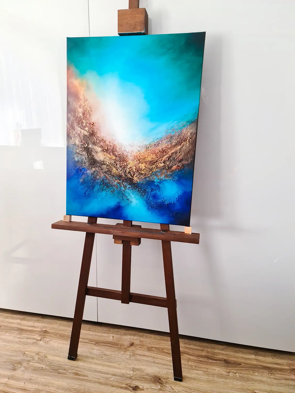 Farby akrylowe Talens Amsterdam i Liqutex nadają obrazowi nasycone i wyraziste kolory, a zróżnicowane struktury powstały z włóknin, gipsów i past strukturalnych. Wykończony jest lakierem akrylowym wysokiej jakości o wysokim połysku, do zastosowań profesjonalnych.