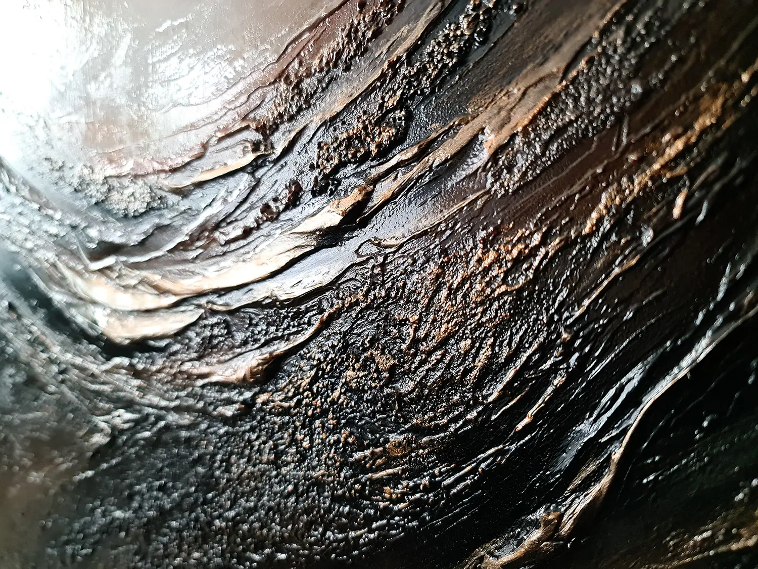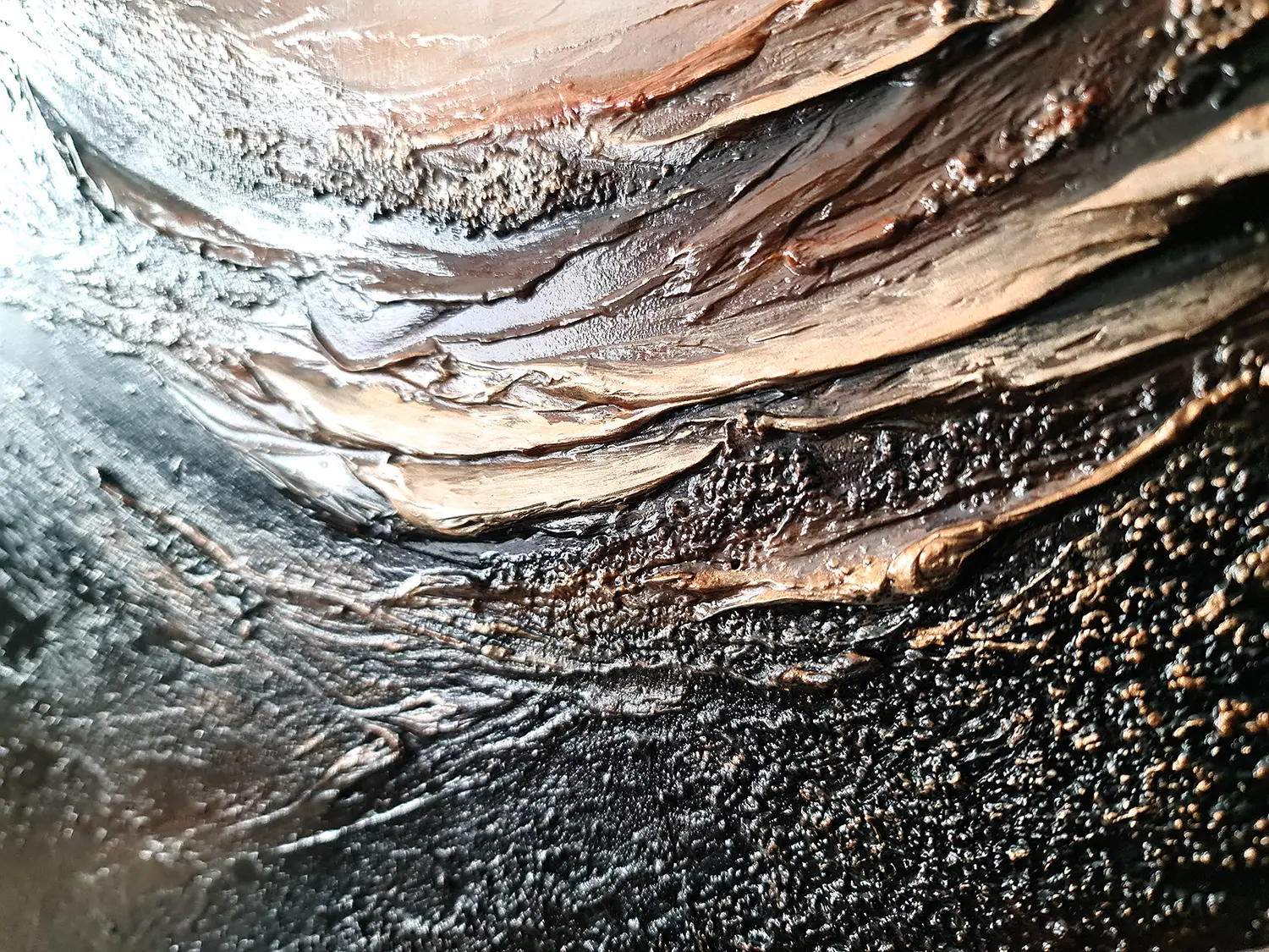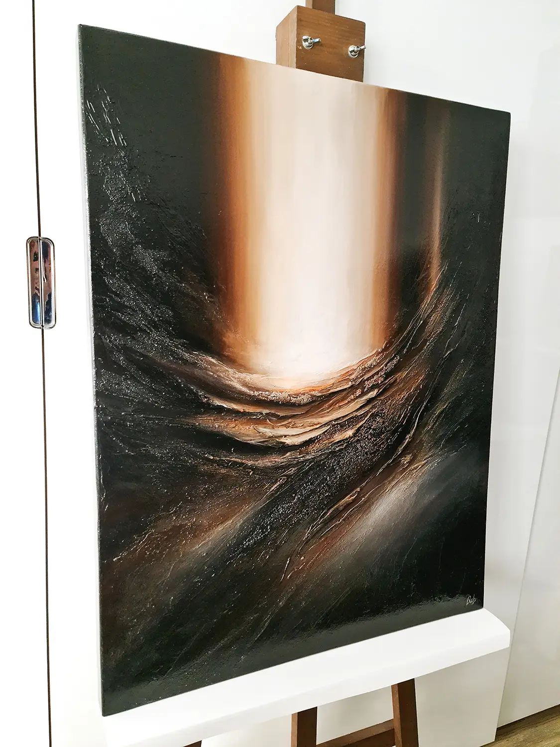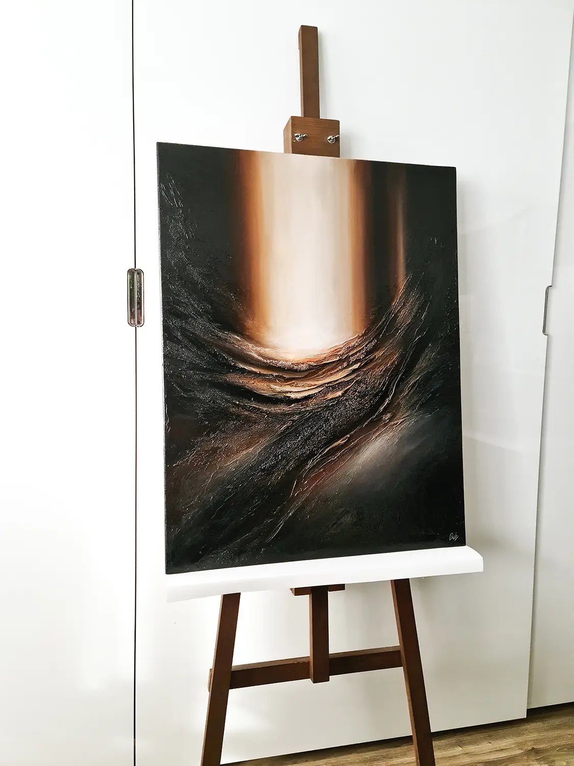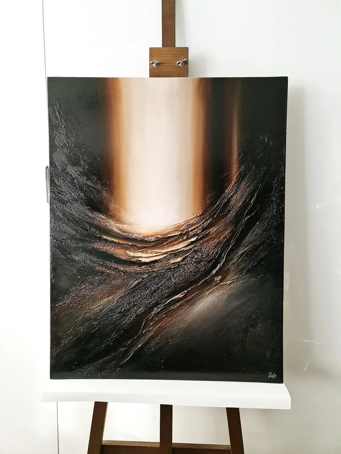 Strukturalny obraz abstrakcyjny namalowany jest na litym panelu, który wykonany jest z drewna i elastycznego tworzywa sztucznego. Farby akrylowe Talens Amsterdam i Liqutex nadają obrazowi nasyconego i wyrazistego wyglądu, a zróżnicowane struktury powstały z gipsów i past strukturalnych. Wykończony jest lakierem akrylowym wysokiej jakości o wysokim połysku, do zastosowań profesjonalnych.